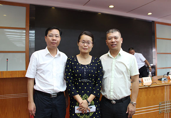 民建市委领导与爱心企业长沙开福湘肤中医皮肤病门诊部代表(右一)合影