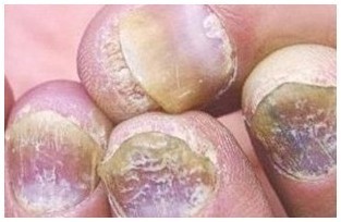 3、慢性皮肤粘膜念珠菌性甲型灰指甲:发病时全甲变质、膨起、松脆,表面疣状,凹凸不平。